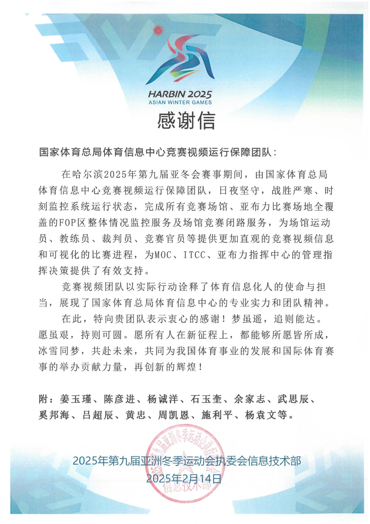 赛后,第九届亚冬会执委会向金陵体育发来感谢信,感谢金陵体育为哈尔滨亚冬会的成功举所作的贡献。